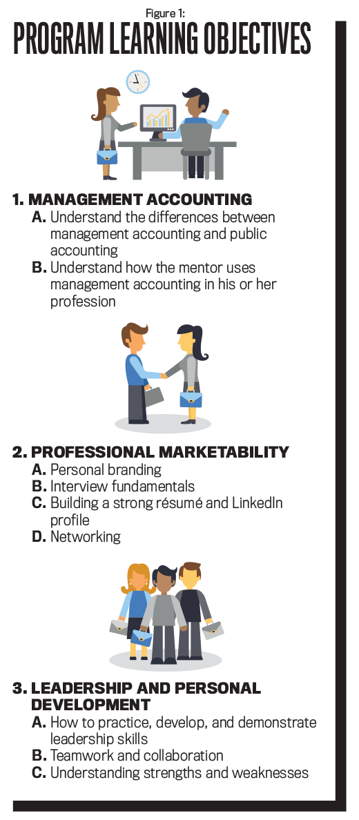 These stipulations were important not only to ensure that the required time commitment was reasonable and understood, but also to ensure that the learning outcomes would be relatively similar for all the students involved while retaining enough flexibility for individual goals. In addition, the mentoring program tied in well with IMA’s vision “to be the leading resource for developing, certifying, connecting, and supporting the world’s best accountants and financial professionals in business” and endeavoring to “support members’ career development through access to an active professional community, continuing education, valuable information, and resources.”