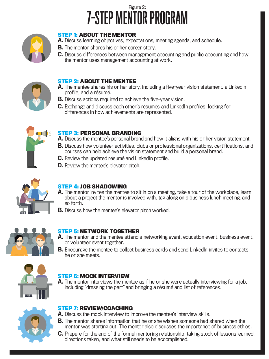 Step 3 explores activities the mentee might use to develop his or her personal brand and professional image. These activities would include developing an elevator pitch, producing an updated LinkedIn page and résumé, and getting involved in professional organizations such as IMA. Mentors guide mentees in this process without explicitly telling them what their brand should be or the content of the elevator pitch. One mentee commented, “The mentorship program was extremely instrumental in pushing me to alter my résumé for each job opening while carefully thinking about how I want to brand myself. Each job opening requires different specialties, so being able to show that you are uniquely qualified for the particular position is important. Think about your distinct specialties that differentiate you from all the other applicants and emphasize those.”