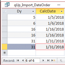 Create a new query based on the importOrders table. Add the Dy field to the grid. In the second column of the grid, enter CalcDate: DateSerial(2018,1,[Dy]) to create a calculated field. CalcDate is the new field name, and the DateSerial function creates a date when given a numeric year, month, and day. We know the data came from January 2018, so those arguments are coded directly into the function, and the Dy field is used to get the specific day. Switch to Datasheet view to verify that the calculated date is correct (see Figure 1).