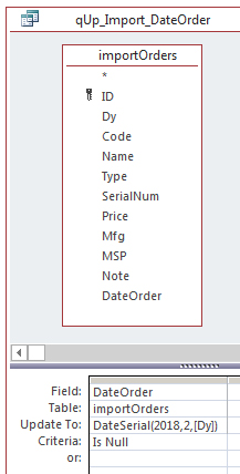Like with the January data, the OrderDate needs to be updated for the newly imported data. Open qUp_Import_DateOrder in Design view. Since this data is for February, change the Update To expression under DateOrder to DateSerial(2018,2,[Dy]).
